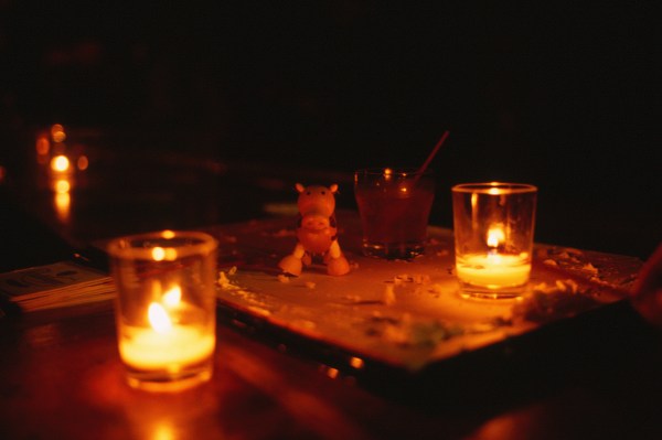 My friend Jason moved to Brooklyn last weekend — quite near me, in fact! — and I’ve managed to see him 4 times this past week, illness and work be damned.  One night we ended up at The Brooklyn Inn, where the couple sitting next to us at the bar offered us a piece of birthday cake.  After splitting our slice of cake, Jason proceeded to spruce up the wee rubber cow (pig?) toy that somehow ended up on the cake tray.   The Leica did a pretty decent job in low light, all things (200-speed film, my ongoing metering issues, whiskey) considered.