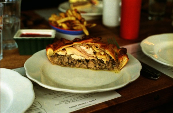 Last weekend, we celebrated Mike’s birthday with a suckling pig feast at Back Forty. (More on that in a post to come.) To celebrate the fact that we survived the suckling pig feast, Mike, Fred, Ziki and I met up the following morning at M. Wells Diner in Long Island City for a brunch that rivaled the pig feast in sheer gluttonous awesomeness. Fred got the seafood cobbler, described by our waiter as “shepherd’s pie meets Montauk,” a completely apt description for a haddock (we think, anyway) and bechamel-filled ramekin topped with biscuits and gruyere. Sweet lord. Ziki opted for the diner’s signature egg sausage sandwich, a homemade version of McDonald’s Sausage-Egg McMuffin (and a hundred times better). Mike and I split half a meat pie, which, well, you can check out the photo above and the one below. Oh my god oh my god. It came with a cranberry ketchup that gave the proceedings a slightly Thanksgiving-ish air (not a bad thing at all). And we collectively decided that the meal wouldn’t be right without a side of fries. And some banana cream pie for dessert. Of course.