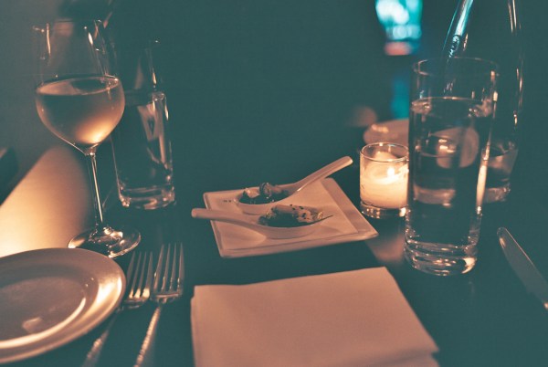 My only point in this post, however, is really twofold: one, we had amuses bouches (see above), which strikes me as a particularly fussy, un-Brooklyn like sort of thing to have, especially at a restaurant called, er, Breuckelen. Secondly, I was amused to discover, upon getting the roll back from the lab, that the photo of said amuses bouches makes the entire dinner look at least a decade and a half older than it really was. Something about the suppleness of the glass of white wine (a very good Gruner, for what its worth), and the amuses bouches in their Asian soup spoons, and the way the light is hitting the table: it’s like this is a photograph of an entirely different restaurant, probably somewhere in west Los Angeles, that was all the rage back in the mid-90s, both known and ridiculed for its small, precious portions of fusion cuisine.