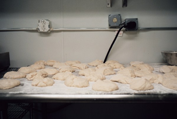 This is where it happens. The magic, that is. Some of the best pizza crust in the city starts here, folks: the borrowed Leica and I got a peek at the downstairs prep kitchen at Co., where my pal Brendan spent a recent Saturday afternoon getting the pizza dough ready for its second (?) rise.