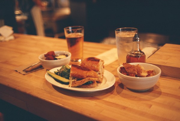 Bar seats figured heavily into my Saturday this past weekend: first, a lovely solo brunch at the bar at Maialino, where I ordered the always-wonderful amatriciana al’forno, and paired it with a glass of Rosso Piceno — an indulgence, sure, but sometimes you gotta treat yourself. Later, while waiting for some film to get processed, I sat at the bar at Commonwealth in Park Slope, where I did a bit of reading alongside a glass (er, maybe two) of Pinot Grigio (note to nice bar owners: there are equally inexpensive bottles of Gruner Veltliner that would make much better house whites, ahem). Then, while strolling through Boerum Hill with Daniel, I caught a glimpse of springtime in the trees above; this was en route to Van Horn Sandwich Shop, where we sat at the bar and split some great hush puppies, mac n cheese, and a fried fish sandwich.
