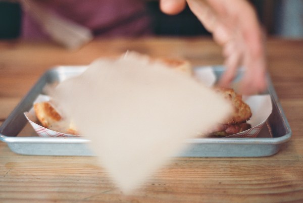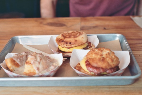 Case in point: brunch last Saturday with Mark. We each ordered egg and sausage sandwiches, Mark’s with cheese and on a biscuit, mine sans cheese and on an English muffin (Bay’s, might I add, which is the best commercial English muffin on the market). Got a side of a biscuit covered in sausage gravy. A fountain soda might also have been ordered. (Ahem.) Total bill came out to I think $18. I’ve had individual brunch dishes in Manhattan that cost $18. And what you see above may not look like much, but sweet jesus, it was good. And filling. Fat, you know, is not only full of flavor but also full of, well, fat. And porky, eggy, biscuity, er, gravy-y glorious fat is very filling.