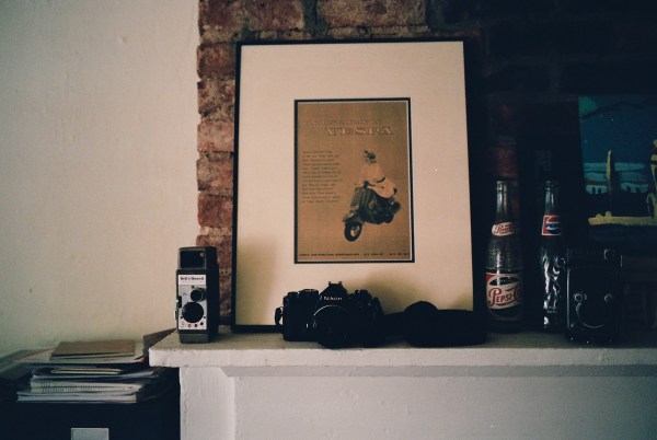 But, yes: this is my room. Or at least the most photogenic part of it. The Vespa poster was a gift from my friends Matt and Robin, a birthday present from 8 or 9 years ago. They’d tracked down the vintage ad, back in pre-eBay days, and had framed it themselves; I love it dearly. Then there are all the cameras — most of them are quite old and the film they use is no longer made, so they’re mostly decorative, as are the vintage Pepsi bottles (I’ve long preferred Pepsi over Coke, which infuriates just about everyone I know). And I wouldn’t be a child of mid-90s indie and college rock without a Steve Keene painting, this one a housewarming gift from my friends Nancy and Rosten.