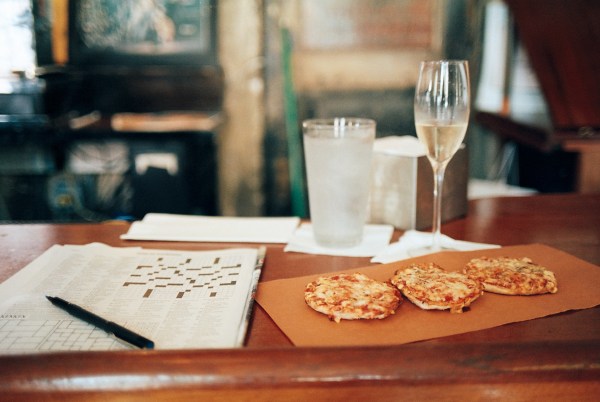 A lot of them involve some combination of Shannon, Marshall Stack, the fat NY Times, the Sunday crossword (always completed in blue, non-ballpoint pen), white wine (or, in this case, on a 90+ degree day, something a bit bubblier), and an order of the Afterschool Special — pizza sauce and cheese toasted atop English muffin halves.