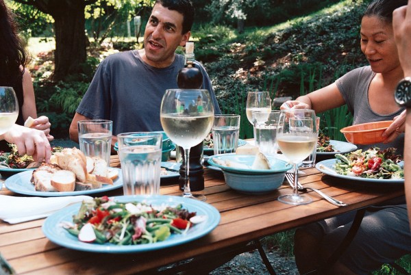 A handful of us went this weekend to our friend Bernard’s country house in Walton, NY, about 150 miles northwest of the city. We got there Friday night, and left Sunday afternoon; inbetween, we made use of the huge kitchen, collaborating on every meal. Saturday afternoon, after running a couple of errands, we sat down for the most langorous late lunch I think I’ve ever been a part of, starting at around 3:30 and ending some time after 6, when the store-bought apple pie had been polished off and everyone went this way and that, mostly to find comfortable spots under the trees to siesta.