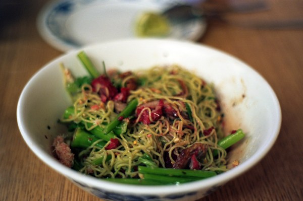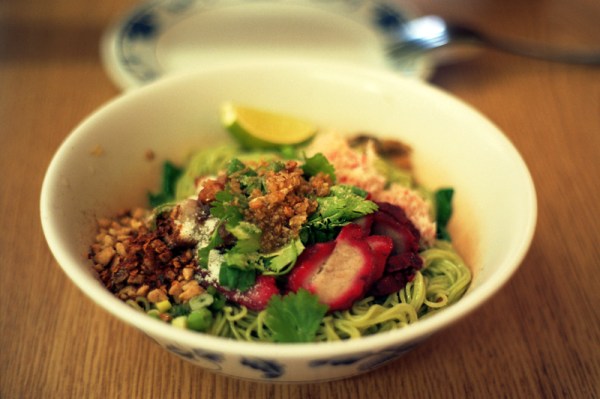No joke.  J and I discovered the jade noodles at Sapp Coffee Shop in LA’s Thai Town last Thursday night, and loved them so much we went back to the restaurant around noon the next day to order another bowl of it.  How can you go wrong: green noodles topped with roasted duck, BBQ pork, and shredded crab meat, plus some greens, crushed peanuts and dried chili flakes, and a lime wedge for good measure.  Stir it up, and dig in.  It will look a mess, but an amazing one at that.
