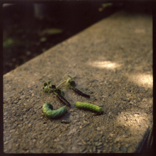 Alas, when you have a garden, you sometimes encounter some curious interlopers. On my last weekend in town, Dad stumbled across two hornworms attempting to cozy up to the tomatoes. We sat them on the ledge so I could take their mug shots.