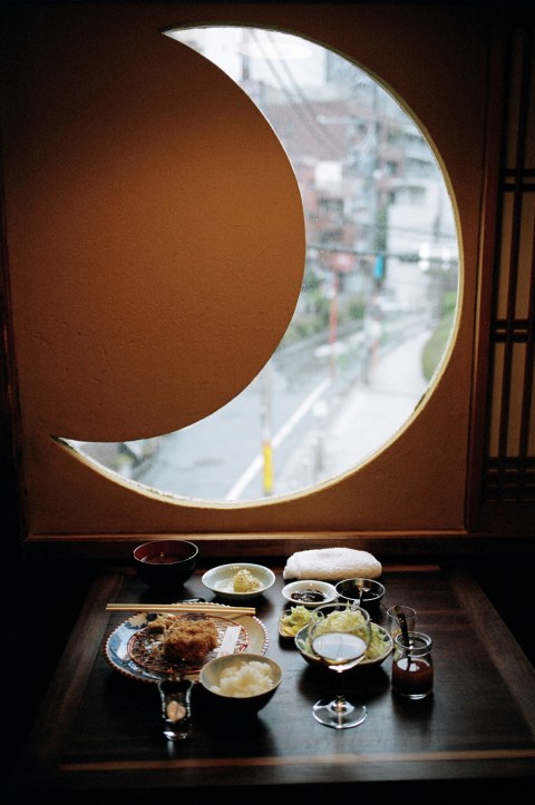 What with Tokyo being full of these narrow alleyways and often no street names to speak of, it’s often difficult to know for sure if you’re headed in the right direction. Butagumi has a great crescent-shaped window on the second floor, so as you approach the building and see the signature crescent moon, you know you’re where you ought to be. You might even luck out, as I did, and get the table by the window:
