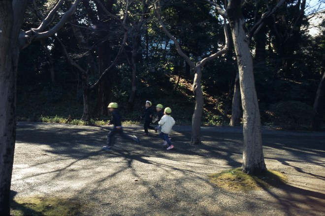 Safety-helmetted children running through Koishikawa Korakuen Gardens: