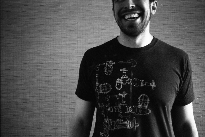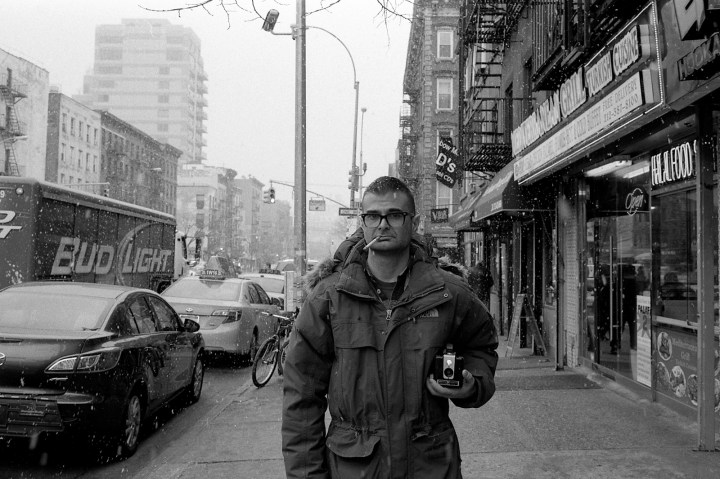 I also discovered that B&H is selling 120 film loaded onto 620 film spools, which means that if you’ve got a thrift-shop-purchased Kodak Brownie Hawkeye or some such toy camera sitting on your bookshelf collecting dust, you could ostensibly take it out for a spin with this re-spooled film (at $13/roll, it’s not cheap!). I loaded my old Hawkeye with some slide film, which I had the lab cross-process in regular C-41 color negative developer. The results? Eh. But at least we had some fun with it. To wit — me and the Leica taking a photo of Illt and the Hawkeye taking a photo of me:
