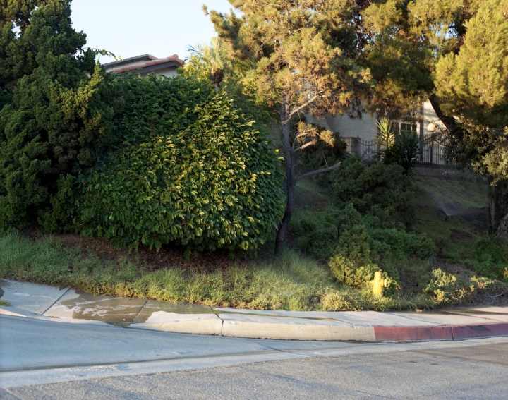 My parents live on a hilly cul-de-sac in Los Angeles.  At the bottom of the hill, just across the street, is a little park with a handful of picnic tables beneath leafy trees; not much to look at really, and there’s no playground, so the place is often empty.  At the top of the hill, right where the street dead ends, is a clearing — I guess there’s a gasline of some sort, maybe a power substation?  I didn’t investigate very thoroughly, though over the course of the week that I was home this past August, I went out every night just before dinner to take a few photos up and down the street.  The photos here are arranged from the bottom of the hill to the very top, where a dilapidated fence makes a half-hearted attempt to ward off trespassers.
