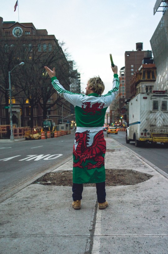 Saturday, March 1st, was St. David’s Day, the feast day of St. David, the patron saint of Wales.  My pal Illtyd has joked every year that he’s the one-man Welsh parade down 5th Avenue — everyone else gets a national parade, c’mon!.  This year we decided to capture him, the Welsh flag, and a handful of leeks properly in the act, so we staged a mini-shoot down in Cooper Square, further south in Manhattan than where parades usually take place.
