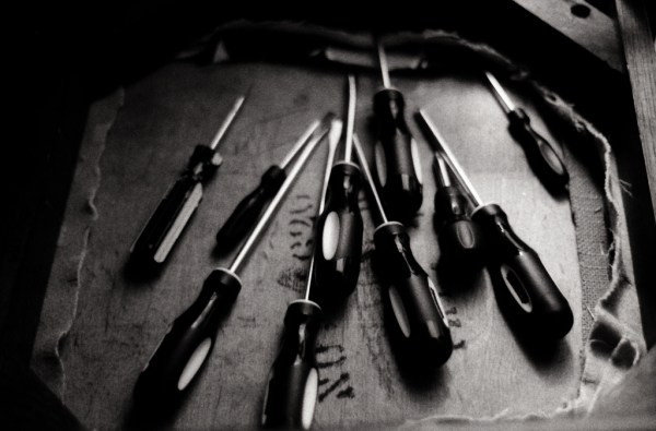 Nearly two years ago, I came home to my apartment one night and in the hallway there was this mise en scene: one of the dining table chairs was positioned upside down (presumably atop another dining table chair facing rightside up), with a cavalry of screwdrivers arranged on the wooden bottom of the seat. I’m guessing that one of my housemates was fixing a loose leg, but for a good day and a half this mini-scene remained untouched. At some point I came downstairs with the Nikon, which was loaded with Ilford Delta 3200 speed film (yes, 3200), and snapped a few pics. And then the next morning, the screwdrivers and upturned chair were back in their normal resting spots. I never did get the full backstory from my housemates as to what the repairs entailed.